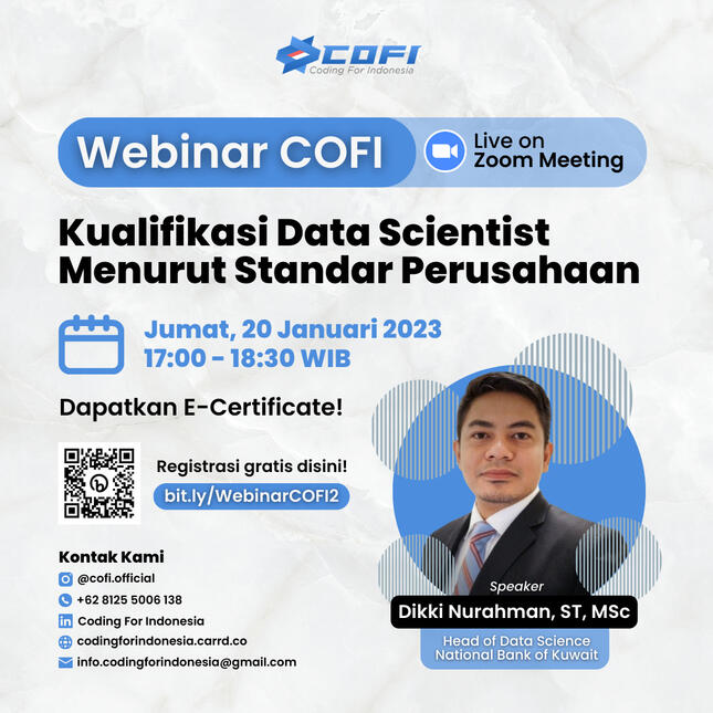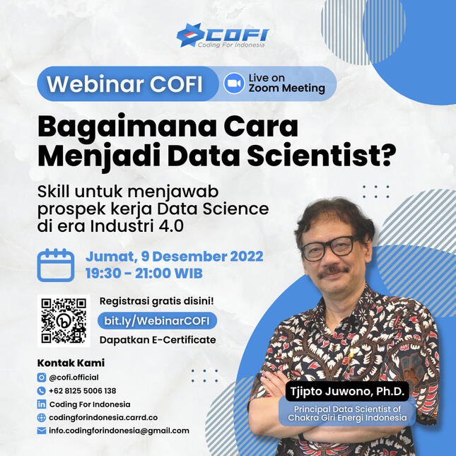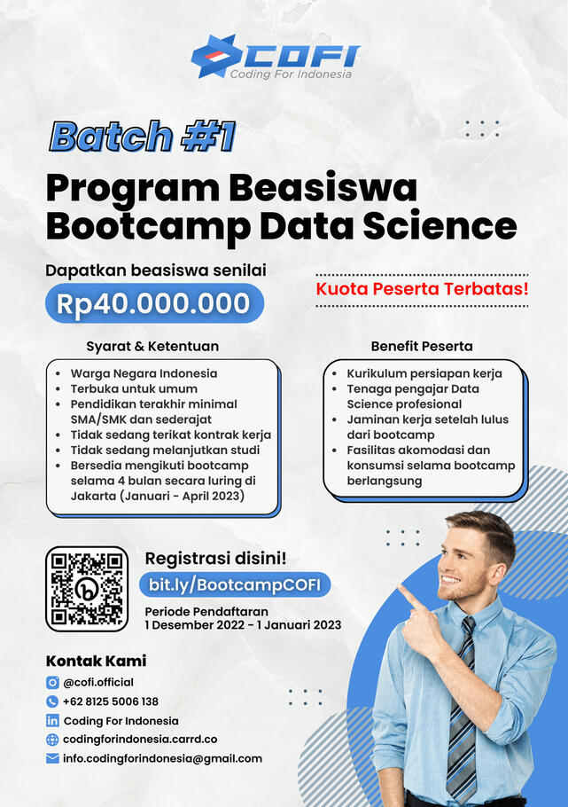 Persiapkan dirimu untuk mengasah kemampuan di bidang data science dengan bergabung dalam kegiatan-kegiatan menarik di COFI. Seminar online, hingga program Bootcamp Data Science. Nantikan informasi selengkapnya hanya di media sosial Coding For Indonesia atau hubungi kontak kami.